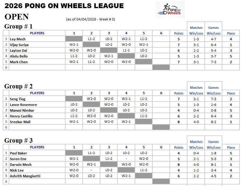 Pong On Wheels 2026 Mar-Apr Ping Pong League: Week 3 Highlights & Standings Update!